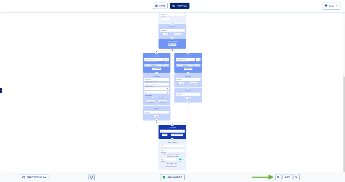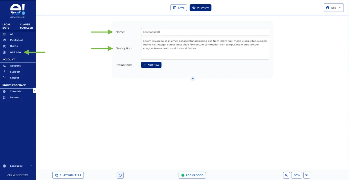 Start building your first Legal Bot in e! — learn how to add nodes, navigate the canvas, check for errors, and chat with Ella, your built-in AI assistant.