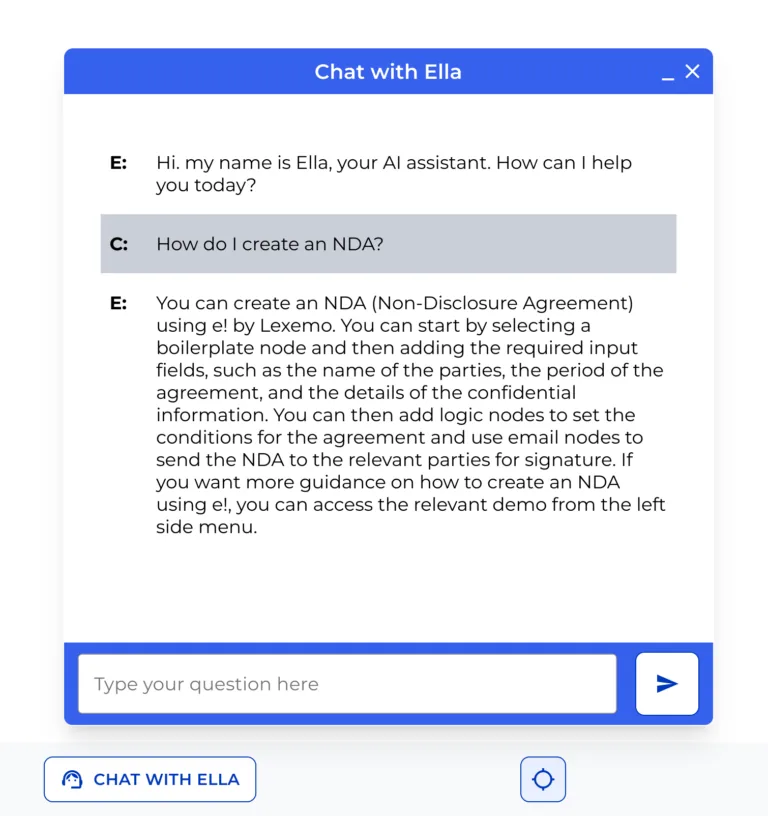 If you need help to build your bot, no worries, Ella is there for you! This powered OpenAI chat will provide immediate support with any legal-related questions you may have.