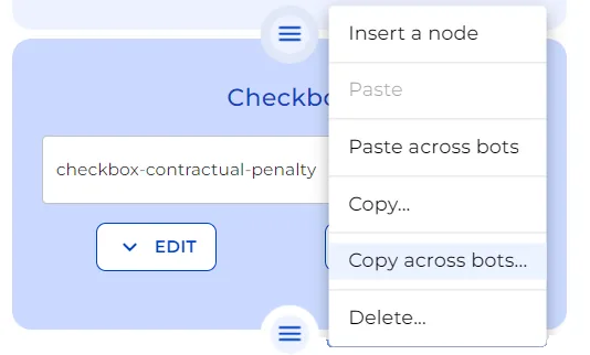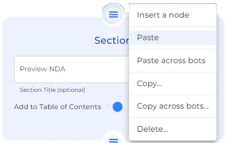 In another bot, to paste between existing Nodes, click on the “burger” icon and select “Paste across bots”. Or, to Paste Nodes to a brand new bot or at the end of a different bot, click the “+” icon and hit the action icon. Select ‘Paste Across Bots’ and there you have it.