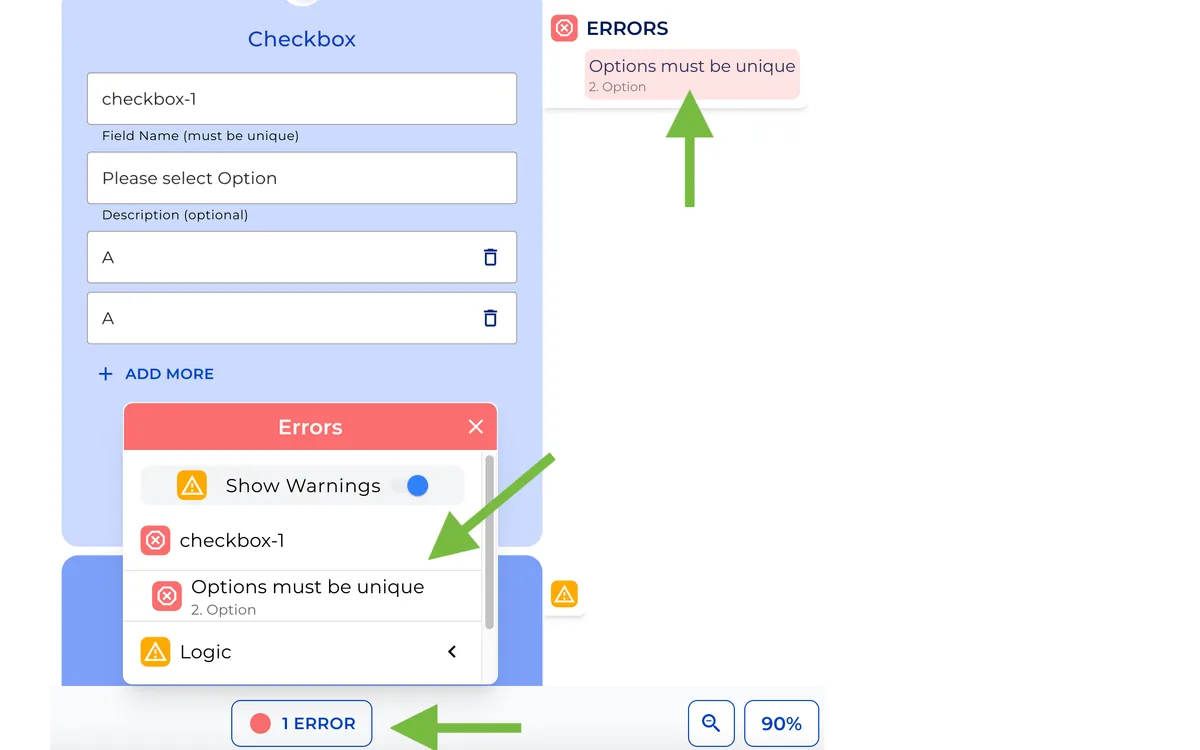 Learn how e! detects errors and warnings in your Legal Bot in real time — with canvas alerts, fix suggestions, and the difference between errors vs. warnings.