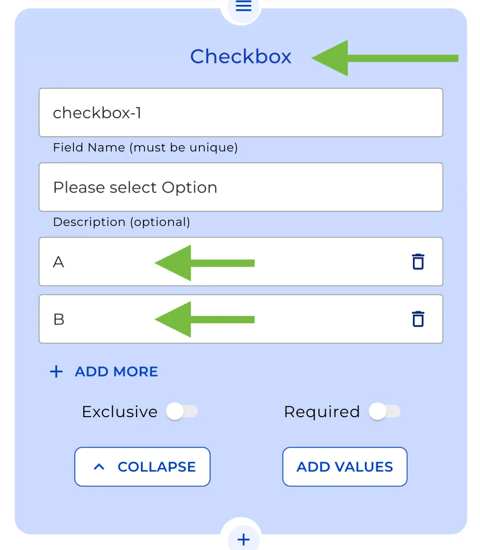 To demonstrate how the Send & Result Node works, we’ll walk through a simple example with a Checkbox Node that has two options, “A” and “B.” We’ll show different results in the front end depending on the user’s selection.