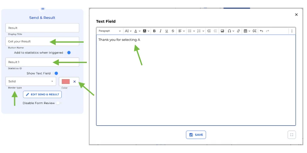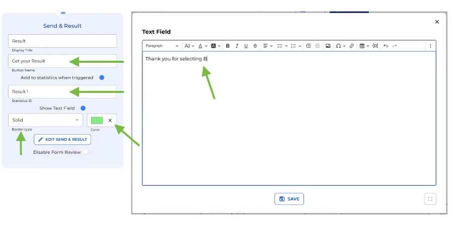 Click “Create” to craft the text for the Result Node, and then save it. You can disable the option for users to review their inputs by toggling “Disable Form Review.”