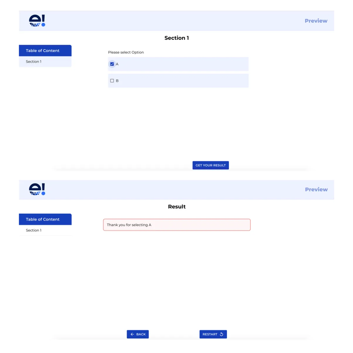 Click the “Preview” button in the header menu to see the Send & Result Nodes in action. In the front end, select “A” and click “Get your result” displays the first result, while selecting “B” triggers the second Result Node with a different colour.